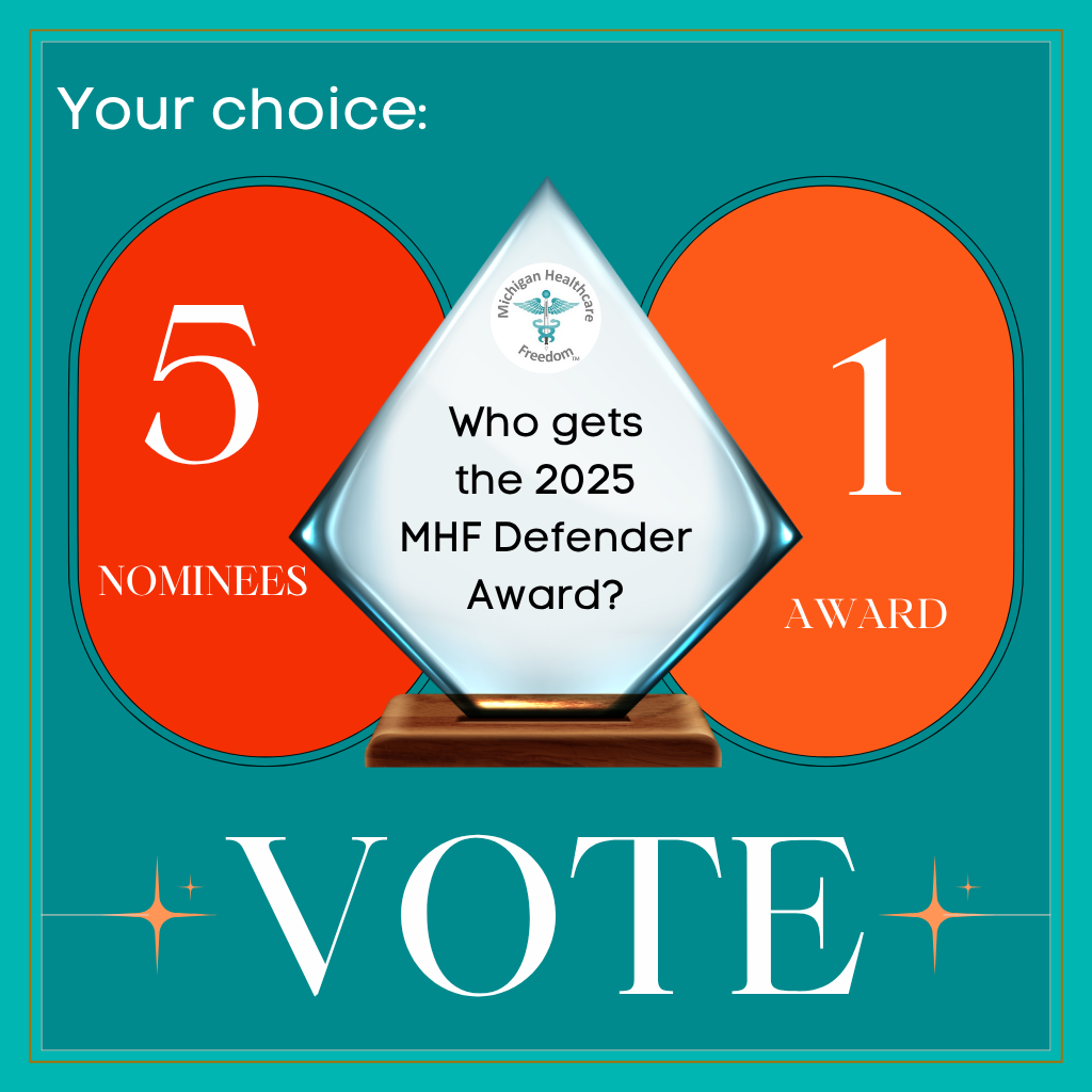 Michigan Healthcare Freedom presents, for public vote, four nominations for the MHF Defender Award. Let's celebrate state legislators who defend healthcare freedom in the trenches of Lansing! MHF announced the award and opened it for public...